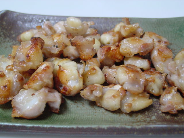 鶏の膝なんこつはフライパンで塩焼きにして、七味唐辛子をつけます。