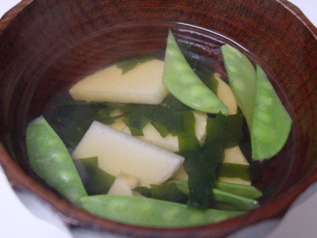 若竹汁もいつもは筍とわかめにグリーンピースを入れたりするのですけれど、代わりに絹さやです。