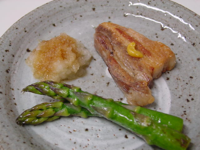 豚バラ肉を2時間ほど蒸した後、何度も返して焼く塩豚は手間隙かかりますが、それだけの価値はあります。大根おろしと一緒に頬ばれば、面倒臭さも吹っ飛んじゃう。焼きアスパラを添えて。