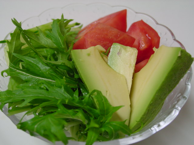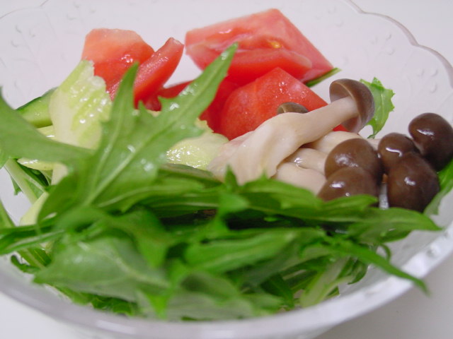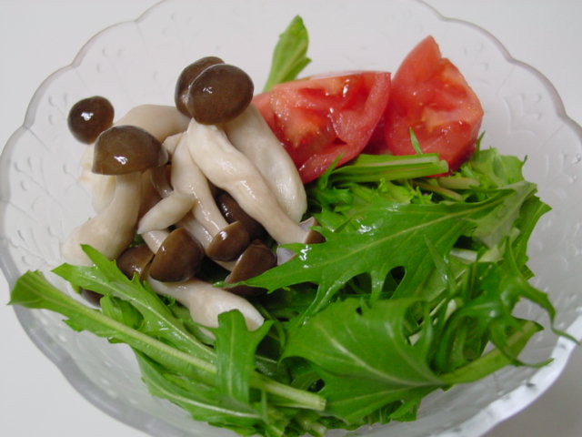 そして、水菜のサラダにはしめじとトマトを加えてフレンチ・ドレッシングをかけています。