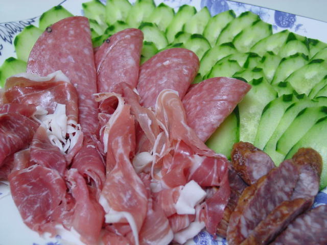 きゅうりを切って並べるだけのプロシュート&サラミ。