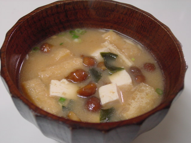 合わせ味噌を使ったお味噌汁には、お豆腐、お揚げ、なめこ、わかめに、薬味としてお葱と茗荷を入れました。