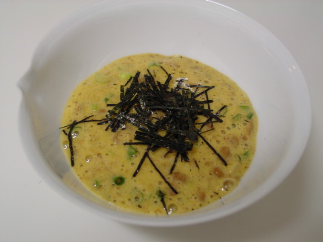 納豆は、黄身を入れよ〜くかき混ぜて置いて、食べる直前にすり胡麻、お葱、辛子をたっぷり入れて、お出汁少々とお醤油を加えます。