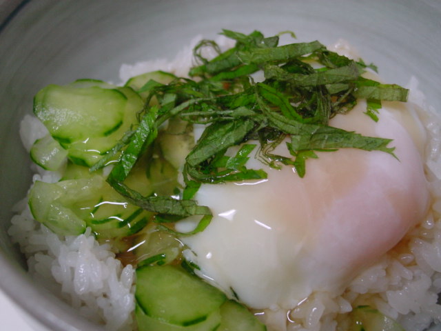 これは塩もみしたきゅうりに山葵を混ぜ込んだものをご飯の間と上に乗せて卵をかける、私がいつも作る卵かけごはんですが、今朝はトッピングを焼き海苔から大葉に代えてみました。
