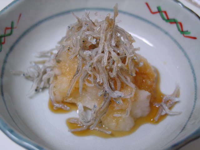 大根おろしのおじゃこ乗っけ。この大根、しっぽなのに全然辛くないし、大根っぽくない。こういう無味なものにも栄養ってあるのかしら?