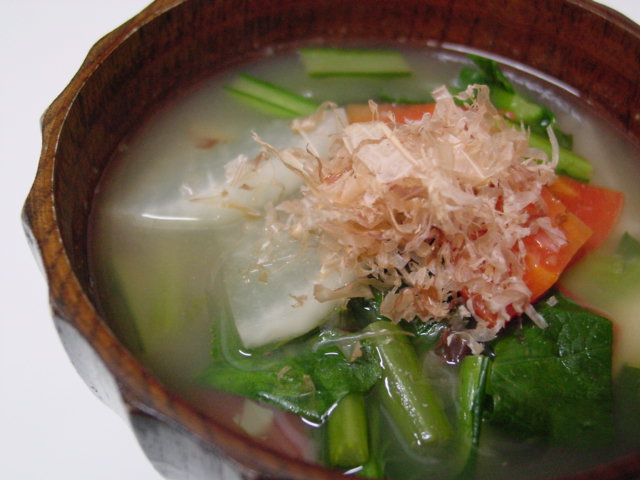 私の作るお雑煮は、彩りに京人参と大根を入れ、かつをぶしけずりをかけます。
