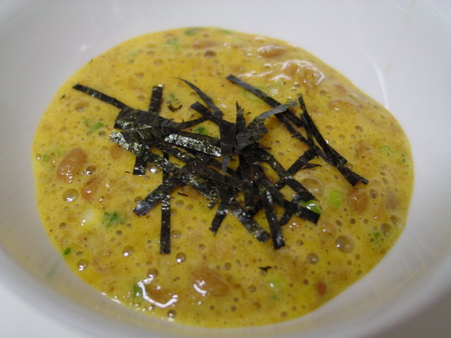 擂り胡麻をいっぱい入れた、納豆。いつも卵の黄身も入れてるけど、先日、お友達と話してたら、黄身なんて入れないって。それって当然って思っていたし、私は入れない納豆は嫌かも。