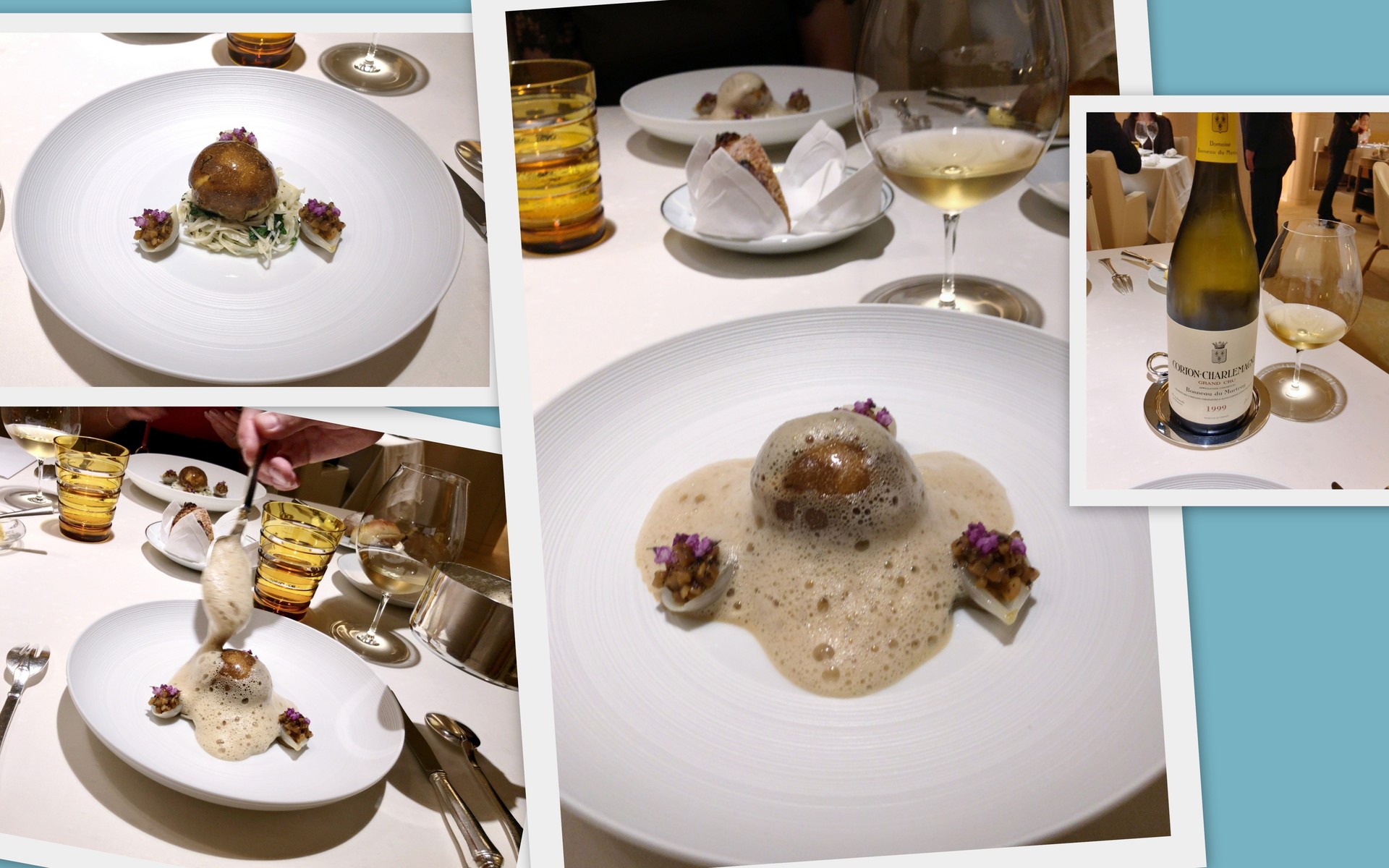 ハタの下の白い千切りのものは、根セロリ。脇の添えられたプティ・オニオンの中にはシャンピニオンのソバージュ。泡々のソースは、セップ茸のエミュルション(乳化させたもの)。