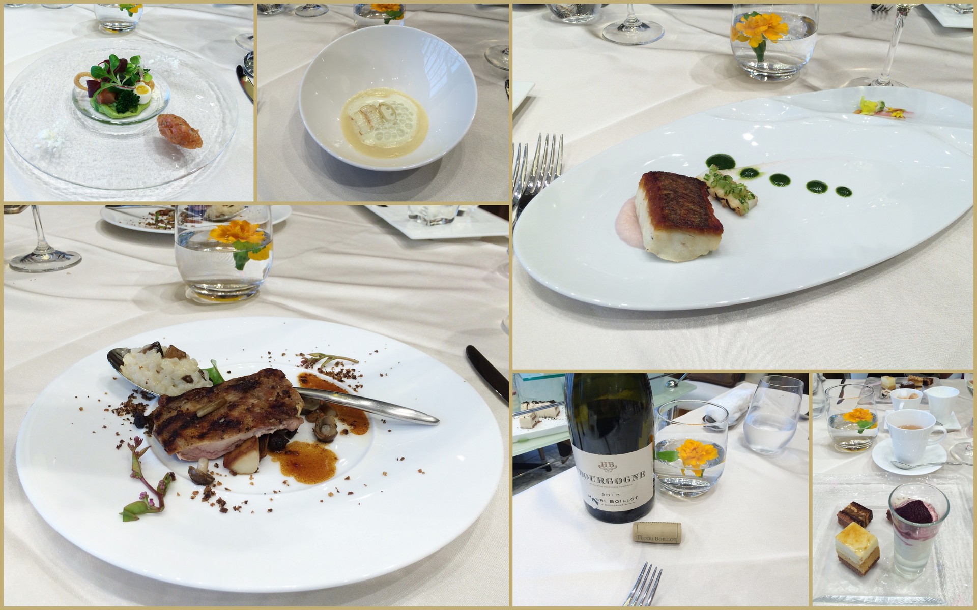 時間が経ってお料理の詳しいことは忘れてしまいましたが、前菜のサラダに添えられたのはサーモンのマリネ。 スープにはポロ葱(リーキ) が使ってありました。そして、お魚料理は、鯛(写真、右上) ピンクのソースは何だったかな〜。