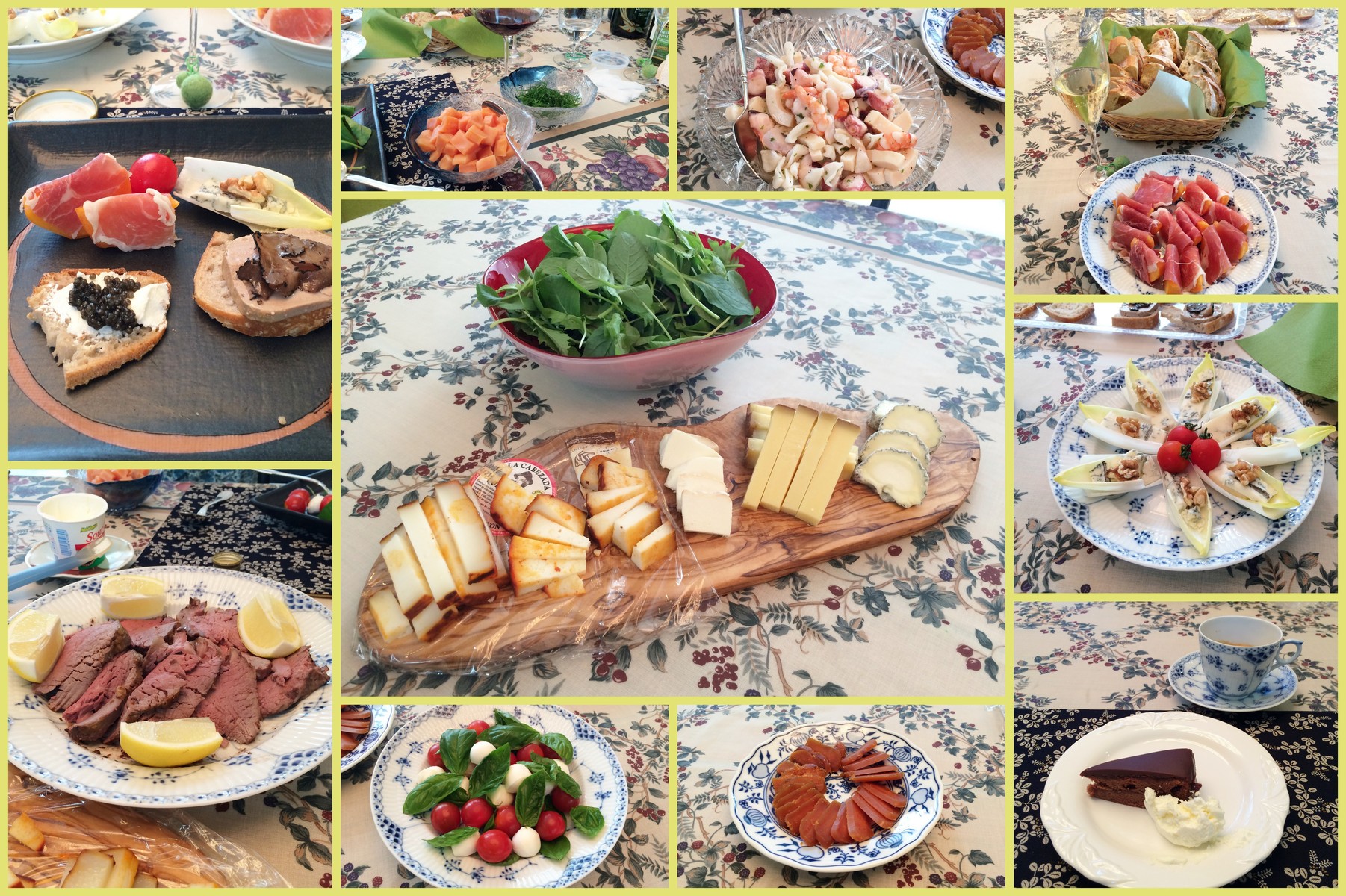 カプレーゼのお隣りは台湾のカラスミ、シコンには青かびのチーズと胡桃を載せて。