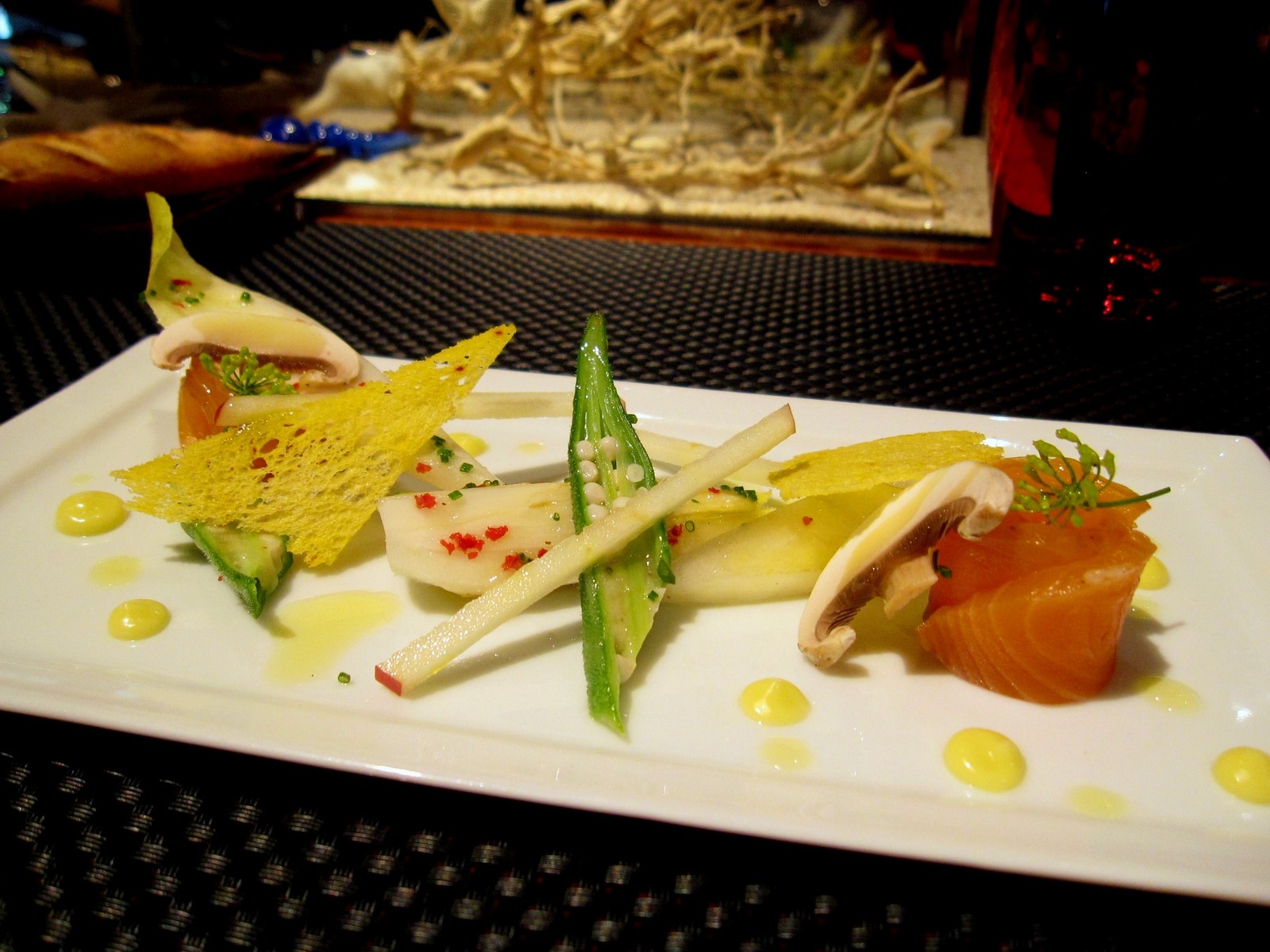 オレンジ色のキューブはサーモン。その右は、魚介のマリネ。