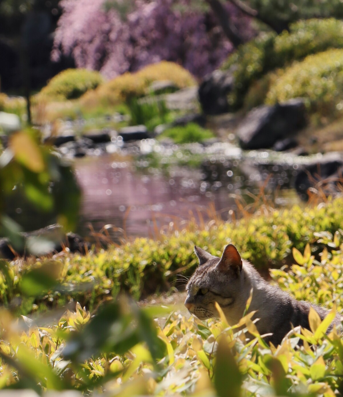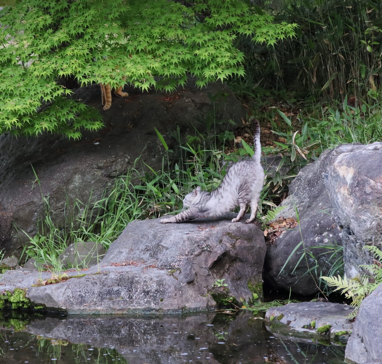 ニャーちゃんは、池でお魚を待っている鵜を狙っていました。