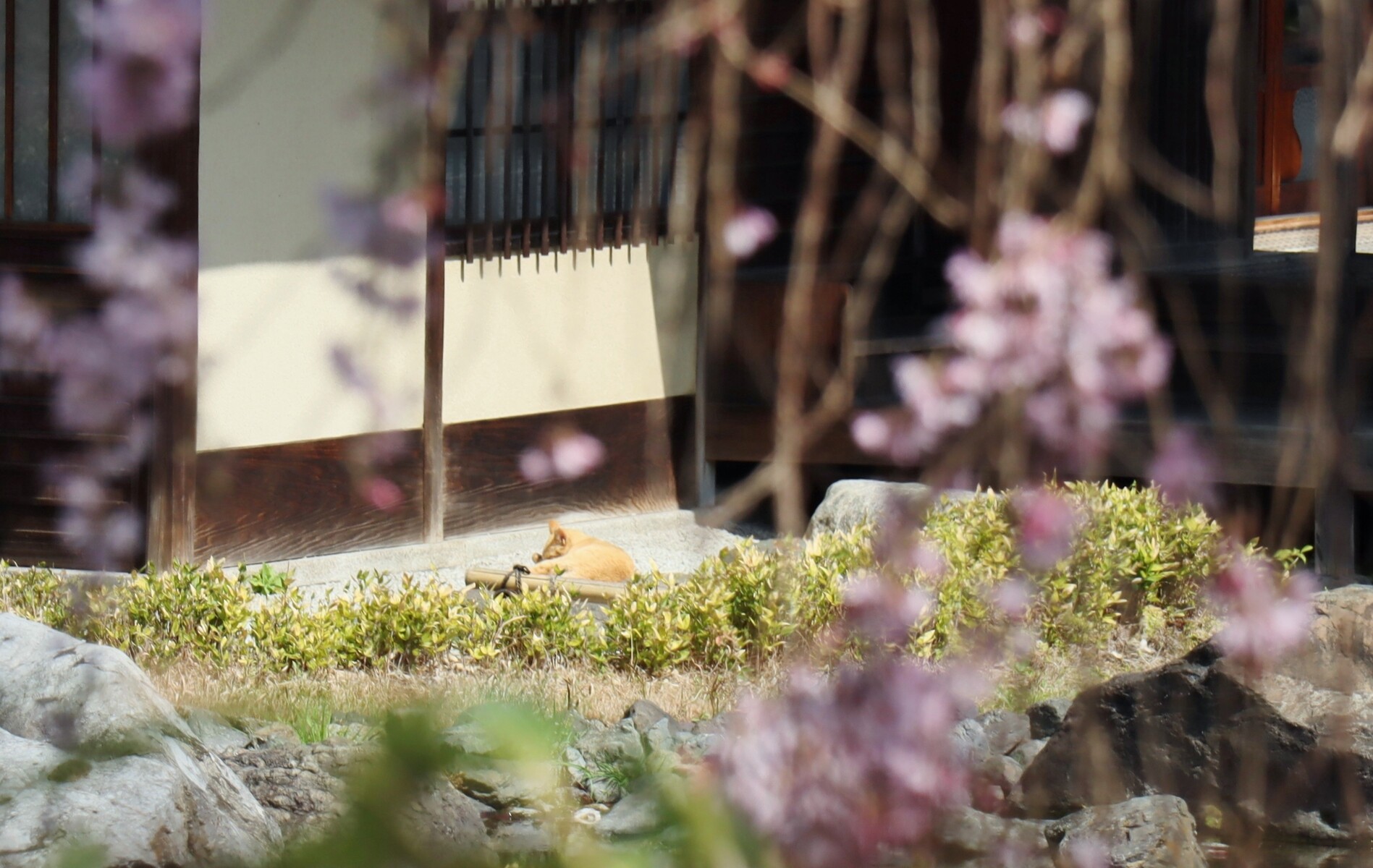 枝垂れ桜の間から お昼寝中のニャーちゃん 盗撮!!(^^)