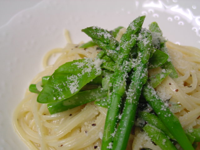 パスタのソースはアスパラとバジルのバター・クリーム。
