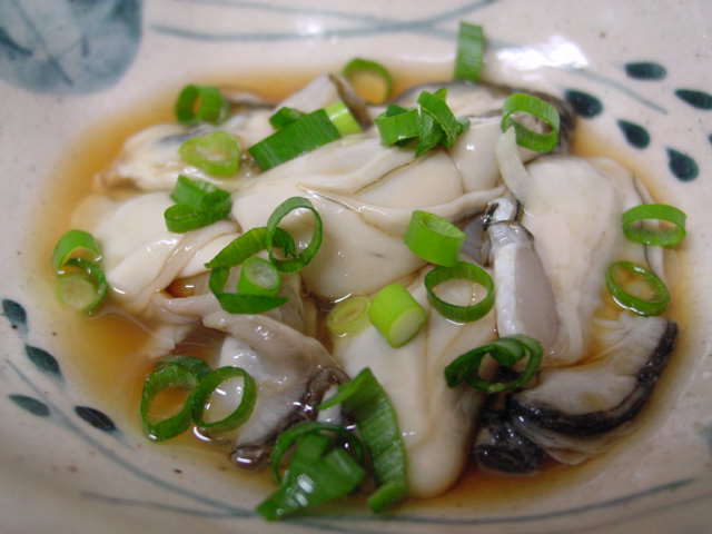 お酒に1時間ほど浸け置いた牡蠣をフライパンで蒸し焼きにして、大根おろしに少量の出汁と柚子酢、醤油で味付けした、牡蠣のみぞれ和え。