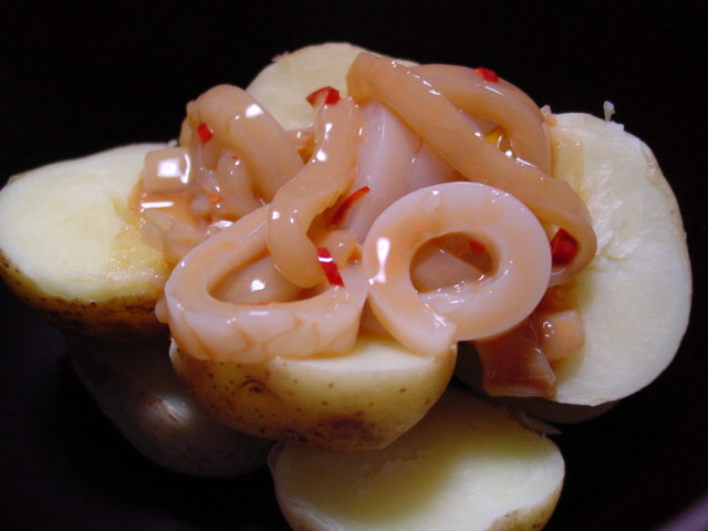 先日TVで見たのを参考に、塩辛をレンジしたじゃがいもにも乗っけてみました。これ、結構いいかも・・・。