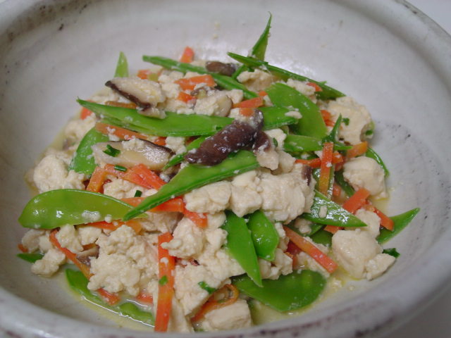 お豆腐は人参、椎茸、きぬさや、お葱などと一緒に炒り豆腐にしてみました。