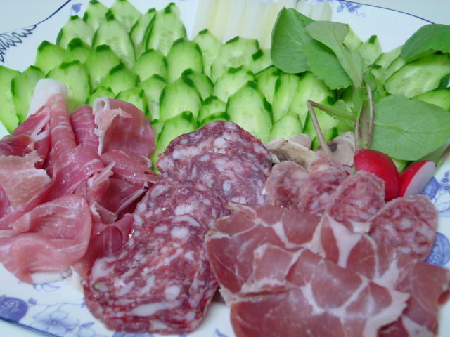 生ハムのプレートにはプロシュート、残り僅かなチンギアーレのサラミ、スペインのフエ・カセーロ、そしてコッパを乗せました。
