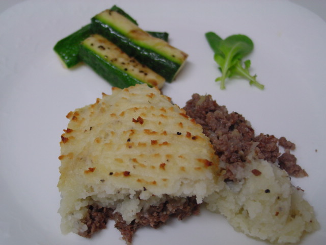 メインはハーブを入れて炒めたミンチにマッシュ・ポテトを乗せてオーブンで焼いた、ハーブ・ミンチとマッシュ・ポテトのオーヴン焼き。ソテーしたズッキーニを添えて。