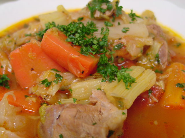 野菜をしっかり煮込むととっても美味しいスープになると分かって、こういった煮込み料理が最近のマイ・ブーム。一緒に煮込んだお野菜は、人参、蕪、セロリ、キャベツそしてフレッシュのトマト。