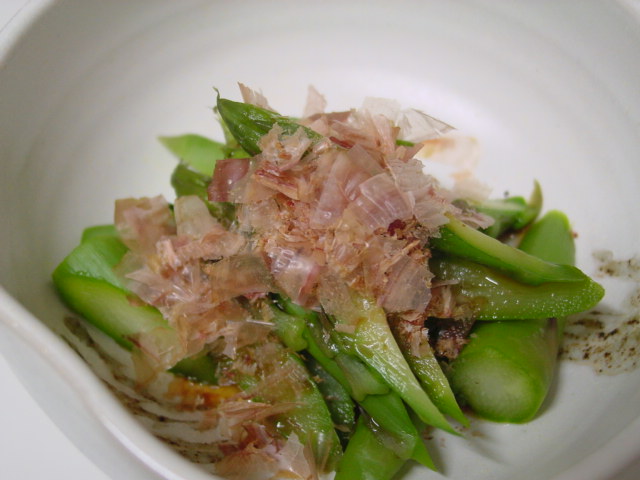 今日の一品目はグリーンアスパラの塩茹でにかつをぶしけずりをかけたもの。