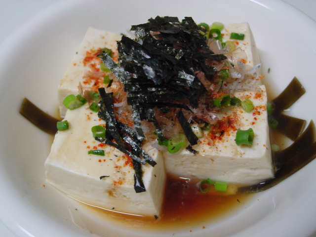 昆布だしの中で茹でたお豆腐に、おじゃこ、お葱、柚子の皮、鷹の爪、を乗せ、お醤油をかけた後、かつをぶしけずりと細切りの海苔をかけて。このお豆腐料理は時々行く大鵬というお店にあるメニューを参考に作ったものなので、私は"大鵬風"と呼んでいます。