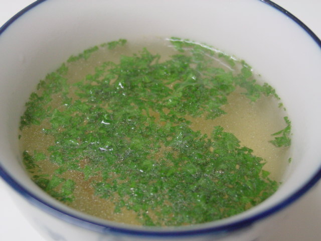 前日沢山買ったあさりを朝の内に茹でて、お汁とあさりに分けて置いていたので、そのあさりのお汁にバターを入れて乳化させた中で、あさりのむき身と茹でたパスタを和え、最後に細切りにした大葉を加えて、ざっと混ぜました。