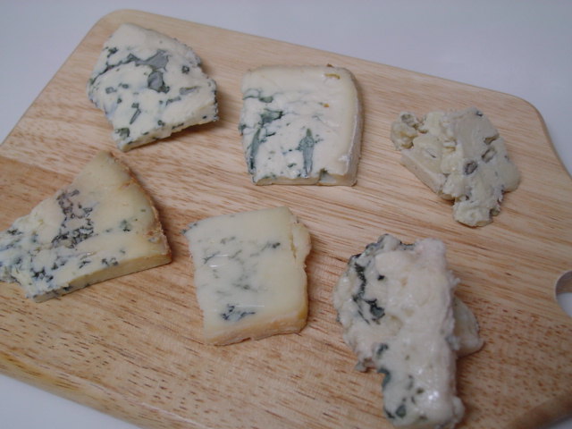 左からエリザベス女王が大好きだと言うスティルトン、柔らかく青かびも優しいイタリアのゴルゴンゾーラのピカンテ・タイプ、青かびの風味と塩味が共にしっかりしているフランスのロックフォール。