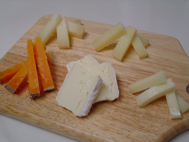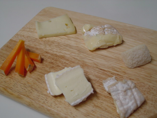 チーズは、上の左側がスペインのケソ・マンチェゴ、右がイタリアのアジアーゴです。下の左はミモレット、そしてブリー、その右がイタリアのペコリーノ・トスカーノ。この中では、私はブリーが好きですが、ミモレットも人気者でした。