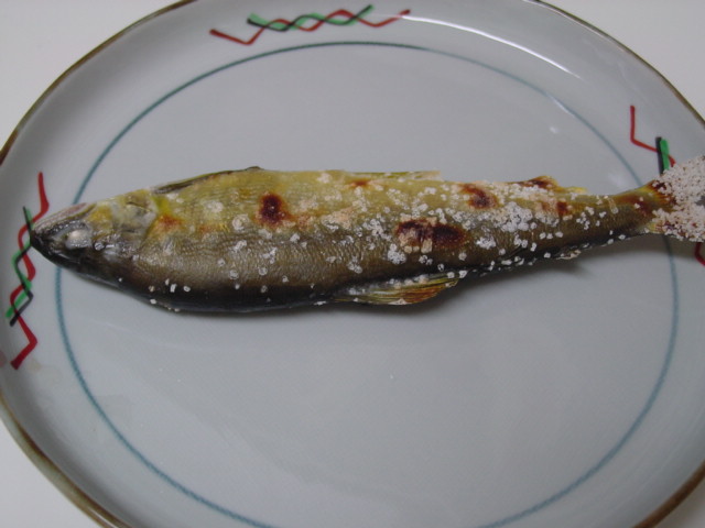 鮎の塩焼き。いつも上手に形を作れないので、今日はそのまま平ったく焼いただけです。私はほとんどの魚の皮は残しますが、鮎だけは皮ごと食べるのが好きですが、この写真、お魚が逆さ向きのような・・・(笑)