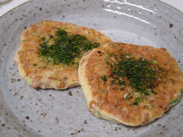 納豆のお好み焼き。すりおろした大和芋、小麦粉、卵、お出汁、お醤油、お葱に納豆を加えてガンガン混ぜて焼きます。焼き上がりに辛子とお醤油を塗って青海苔をかけました。