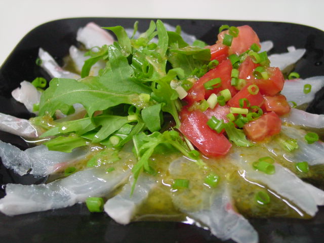 "真鯛のカルパッチョ" にかけたオリーヴ・オイルには柚子胡椒を溶かしました。そして、レモン汁ではなくワイン・ヴィネガーで酸味をつけました。