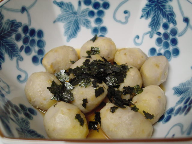 軽く煮て冷まし、山葵、お醤油、お酒で作ったお出汁に浸けて置いて、食べる直前に焼き海苔を振り掛けました。里芋は山葵とも良く合います。