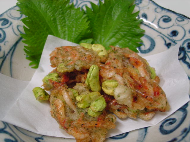 軽く茹でて皮を剥いたそら豆は桜えびとかき揚げにしました。