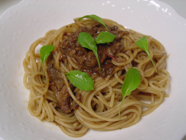 今日のパスタ・ソースは乾燥フンギ・ポルチーニを戻して、トマトと煮込んで作ってみましたが、なんだか味にこくがなかったので、バルサミコ酢も入ちゃった・・・ケレド◎◎!!