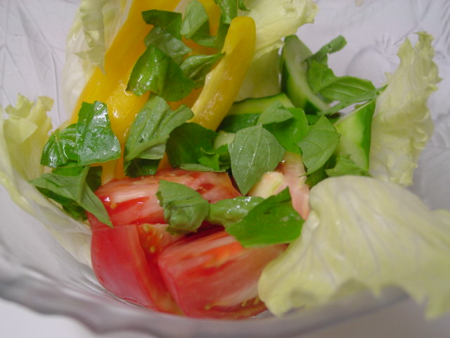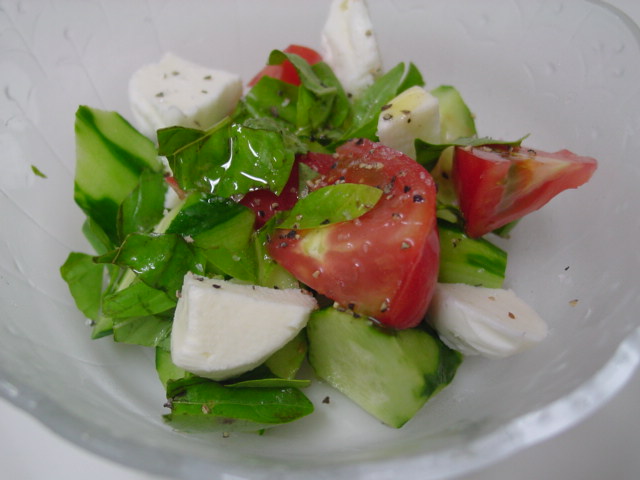 サラダにもモッツアレラ・チーズを使って、トマトとバジルでカプレーゼ+きゅうりも入れちゃいました。