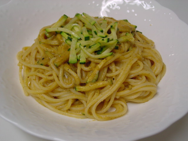 パスタは、炒めたズッキーニとトマトをミキサーにかけてペースト状にしたソースです。少しオリーヴ・オイルが入りすぎた気がしたので、サワー・クリームを入れてみたら、すっきり美味しくなりました。