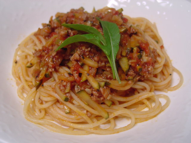代わりに炒めた玉葱に千切りにしたズッキーニを加え再び炒め、水煮のトマト、フレッシュ・トマト、それに別で炒めたラグー(ミンチ)を足して、赤ワイン、塩、胡椒などで味付けしました。