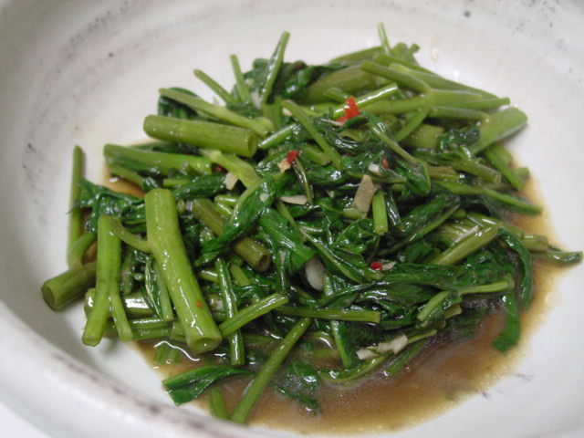 空芯菜の炒め煮。にんにくや赤唐辛子と炒めた後、牡蠣醤油主体で少々煮ました。空芯菜は葉の部分がとろっとしていて、美味しい。