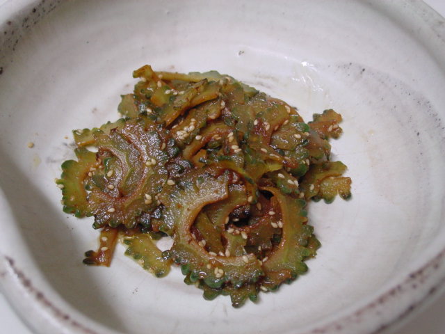 後少し残っていたゴーヤは、ごま油で炒めてお味噌をまぶしました。