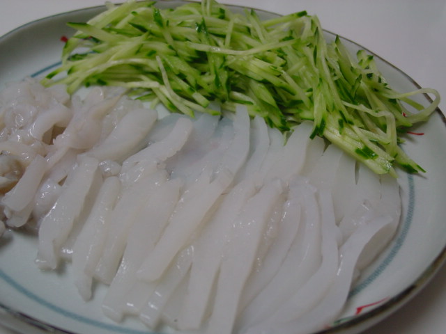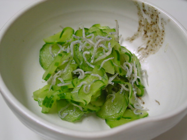 きゅうりとおじゃこのレモン和え。同じ柑橘系でも、柚子とは一味違うすっきりした夏らしい和え物です。