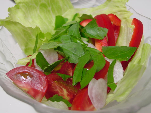 このソースは、山葵とマスタードをオリーヴ・オイルで溶いて、バルサミコ酢を加えるので優しい酸味と辛さがあっていろいろなお野菜に合います。