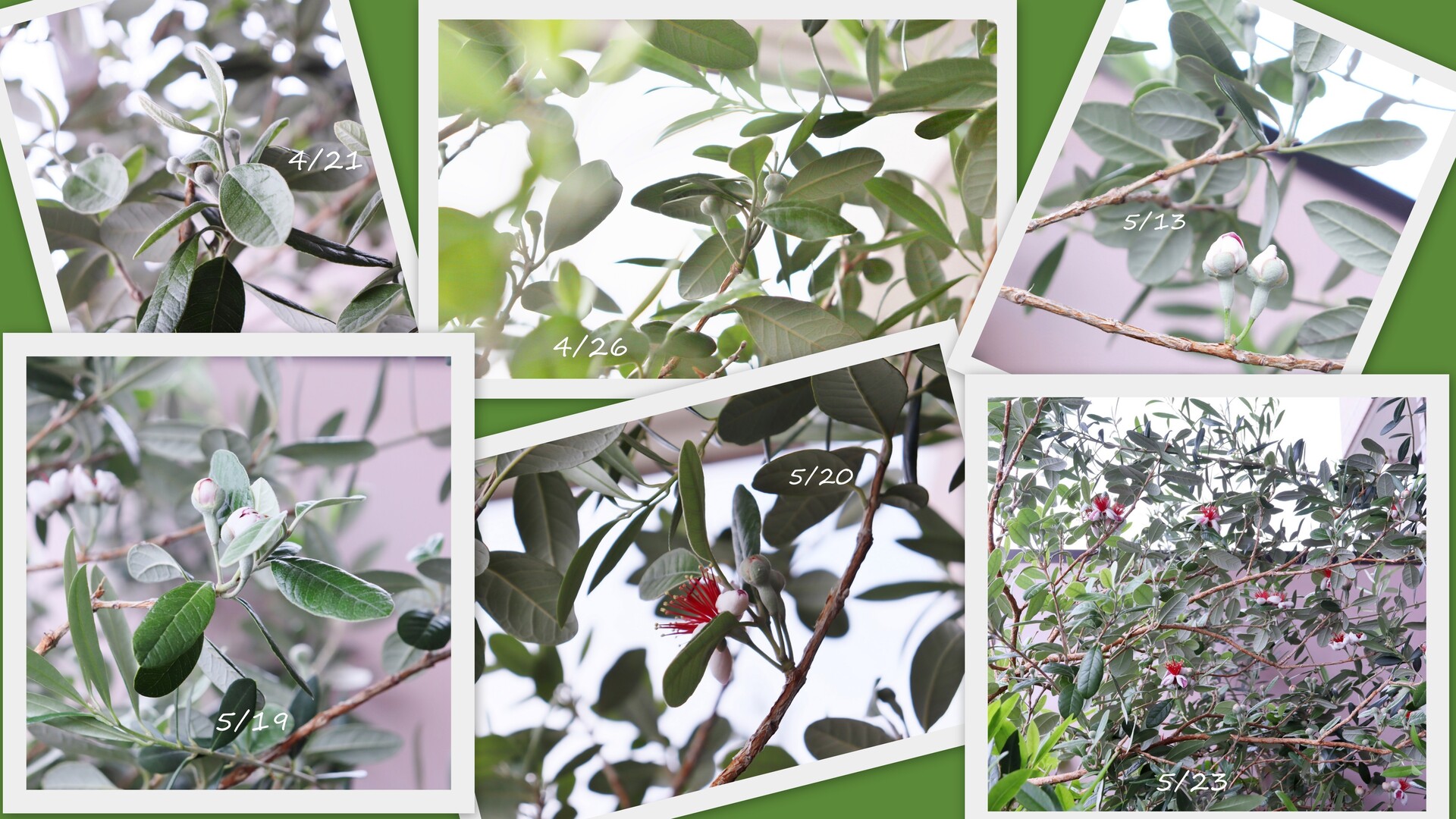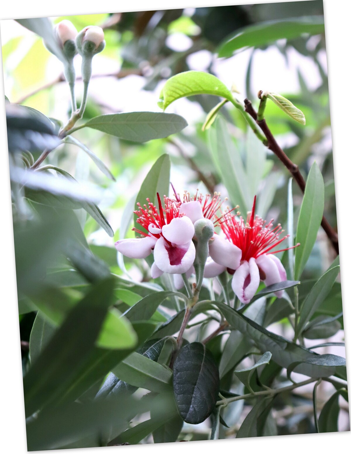 ↓ ベランダで花盛りの "フェイジョア" を飾りました。
