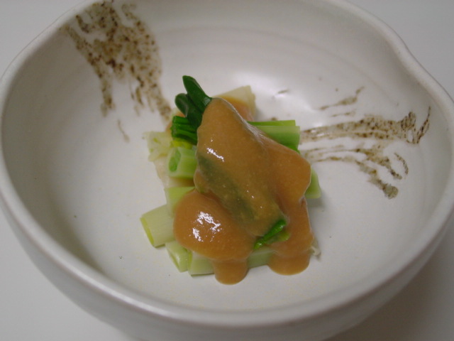 前日の急な"夕食いらな〜い"メールで、酒蒸しにするつもりで買った地はまぐりは茹でて、わけぎと一緒にして味噌和えに。