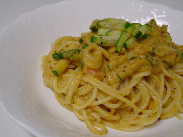 パスタは作り置きして冷凍保存している、ズッキーニのペーストに新たにフレッシュ・トマトと生クリームを足してソースにし、ズッキーニのソテーを加えました。