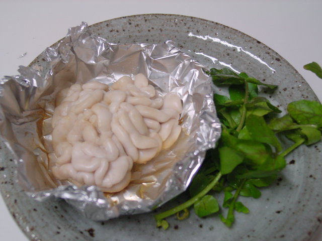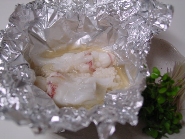 たらの白子のホイル焼き。お酒とお塩を少々入れて蒸し焼きにした後、お醤油をたらしました。どこかのお店で食べて以来、ちょっと気に入ってるメニューです。