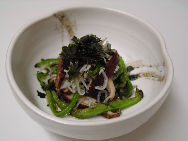 年末に買ったものなのに、元気だったピーマンと椎茸に、おじゃこを加えて焼きびたし。