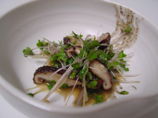 焼いた椎茸とブロッコリのスプラウトの辛子和え。