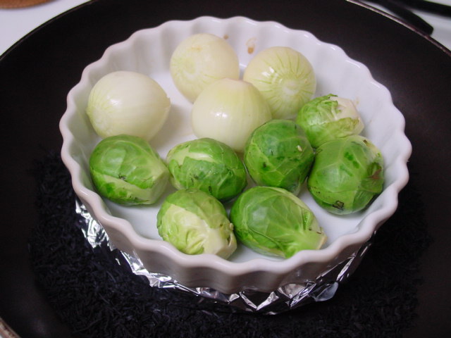 ガーニッシュのペコロスと芽キャベツは、スモーク後蒸し煮にしています。