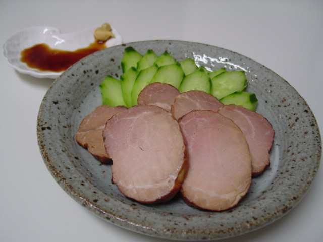 市販のチャーシューには、練り辛子とお醤油をつけて。